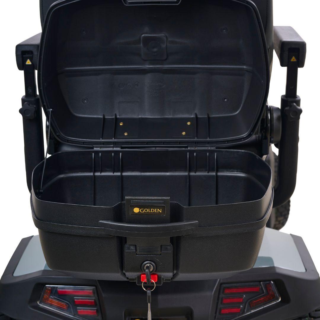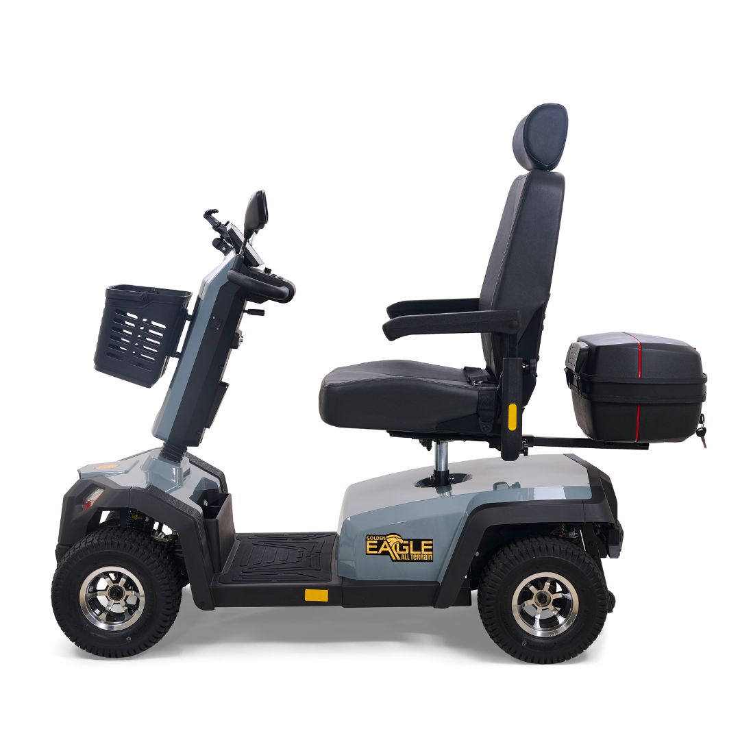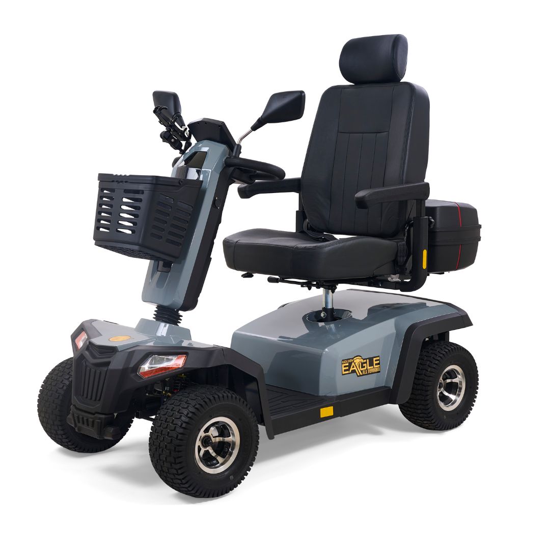 Take your outdoor driving experience to new heights with the Golden Eagle All-Terrain™ scooter. In a class all its own, the Eagle AT’s stylish yet rugged, off-road design is built for superior performance and maneuverability with front and rear adjustable suspension for smoothly traversing outdoor terrain and a powerful 200 Amp controller for outstanding climbing ability. It offers full LED lighting with brake light and turn signals, an infinitely adjustable wraparound tiller, and a reclining, high-back Captain’s seat for maximum comfort, plus durable vibrant red or grey color shrouds for a sporty look. With a 500 lb. weight capacity, 13” pneumatic turf tread tires, up to 34-mile operating range on 75 AH batteries, plus a water-resistant rear carry case for personal items, the Golden Eagle AT offers everything you need to enjoy your next adventure!
